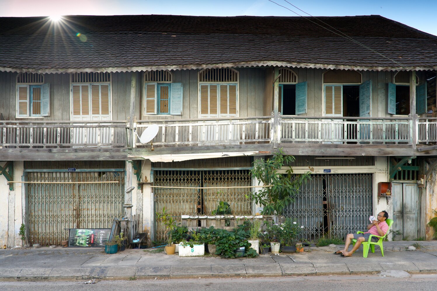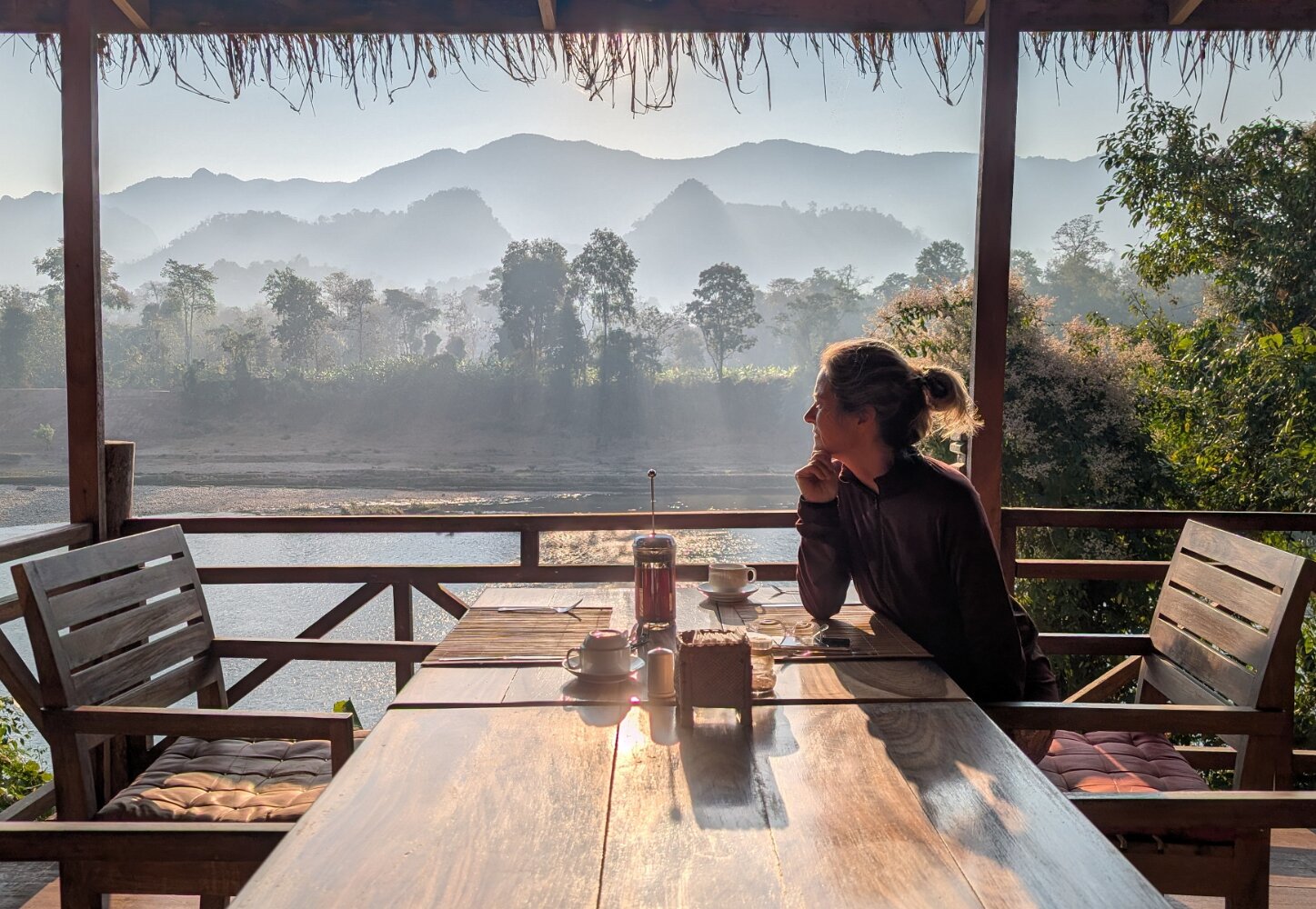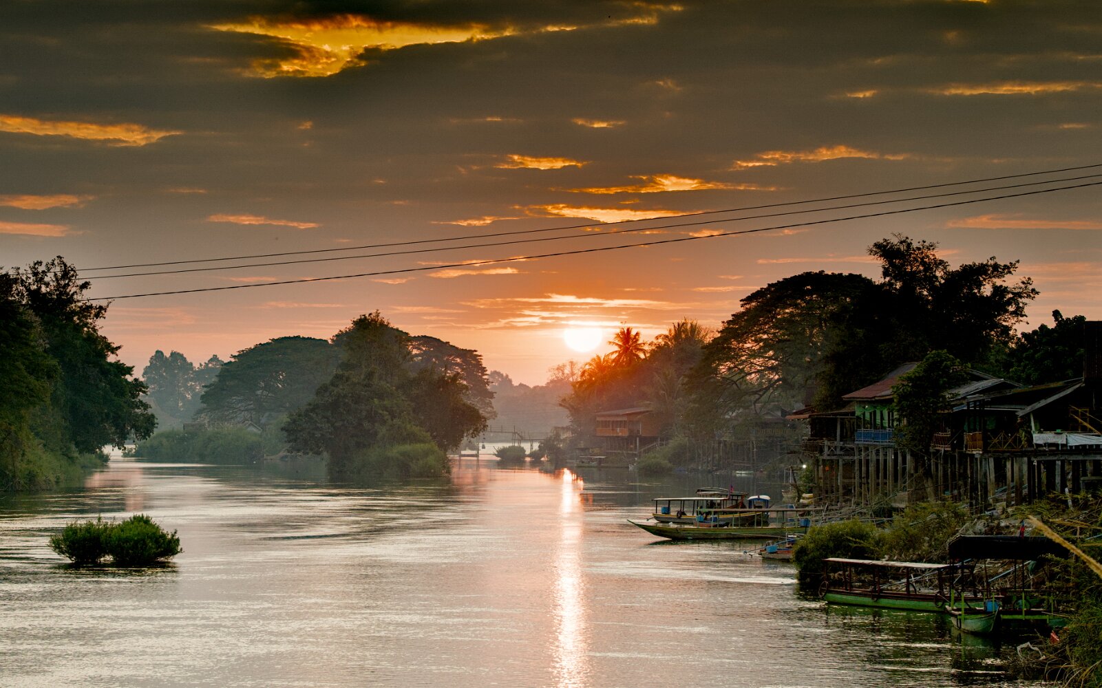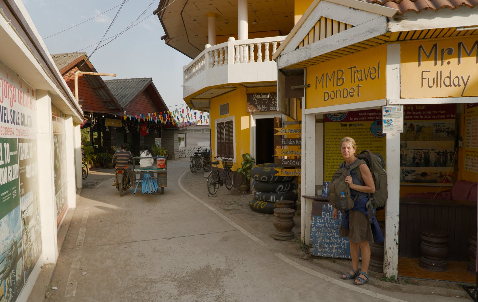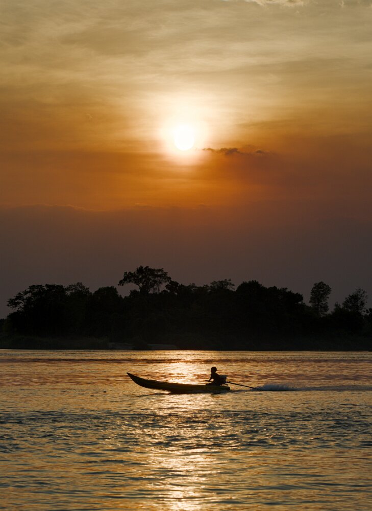 It took us a full day to get from Siem Riep to Don Det, first a bus across de border to Nakasong, and then a ferry to the island. Don Det is part of an area of the Mekong River known, for a good reason, as Four Thousand Islands. It is a backpackers paradise with no cars and glorious sunrises and sunsets: easy, flowy, laid back, tranquil. There are lots of European expats running homestays and bars. And no cars.