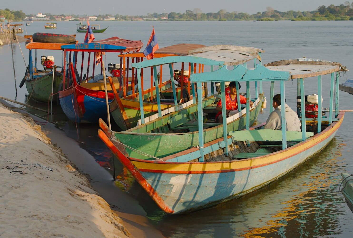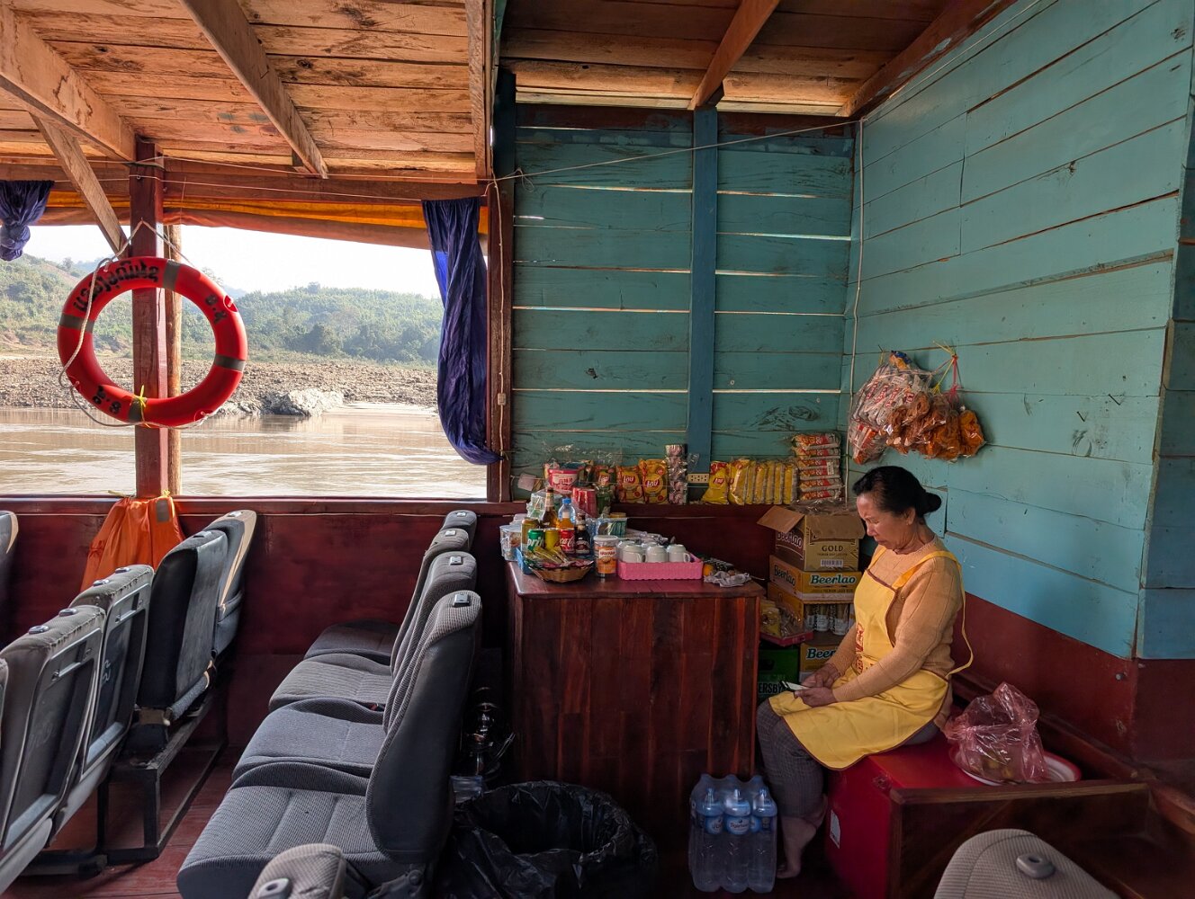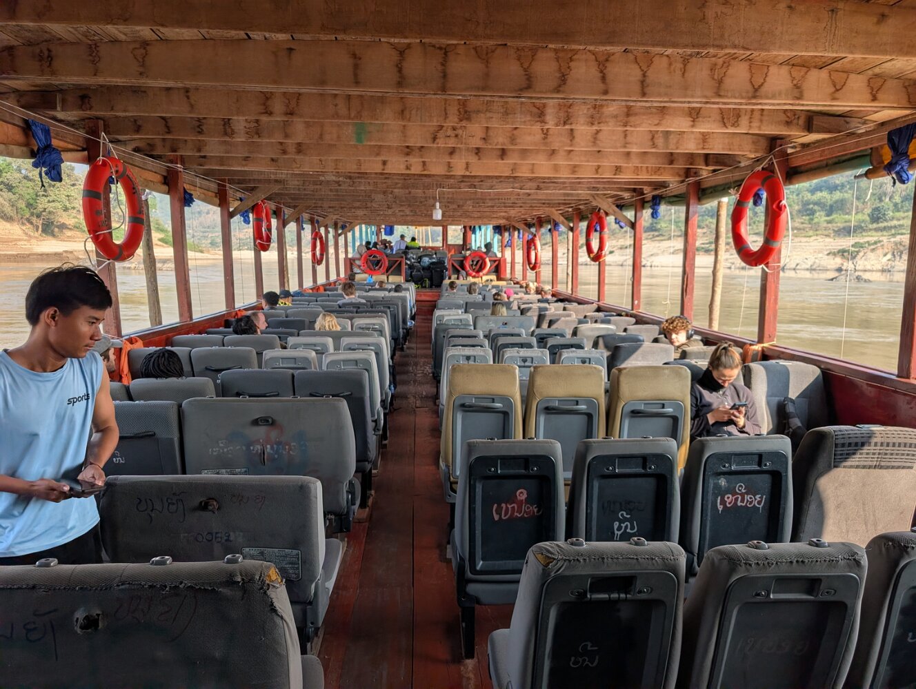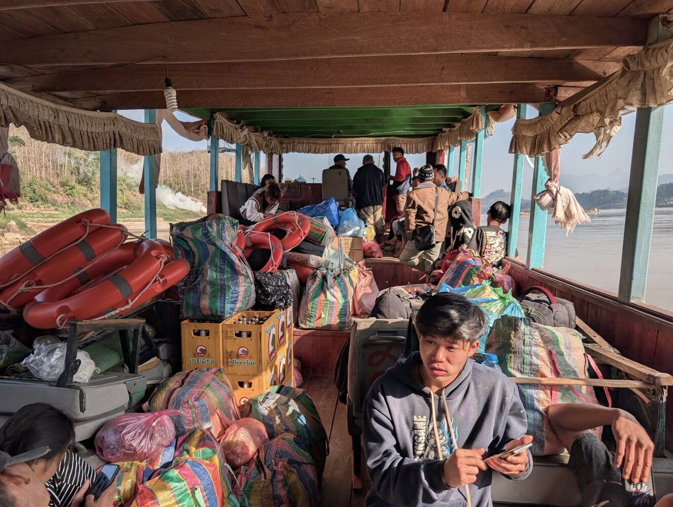 The boats are long wooden vessels with seats taken from passenger vans, and carry an eclectic mix of locals, westerners, and cargo, with no rules except "no shoes" as far as we could tell. They make frequent stops on a sandy beach or just a convenient rock in the middle of nowhere to unload a family with a dog in a bird cage, cases of Lao Beer, and perhaps a motorcycle.