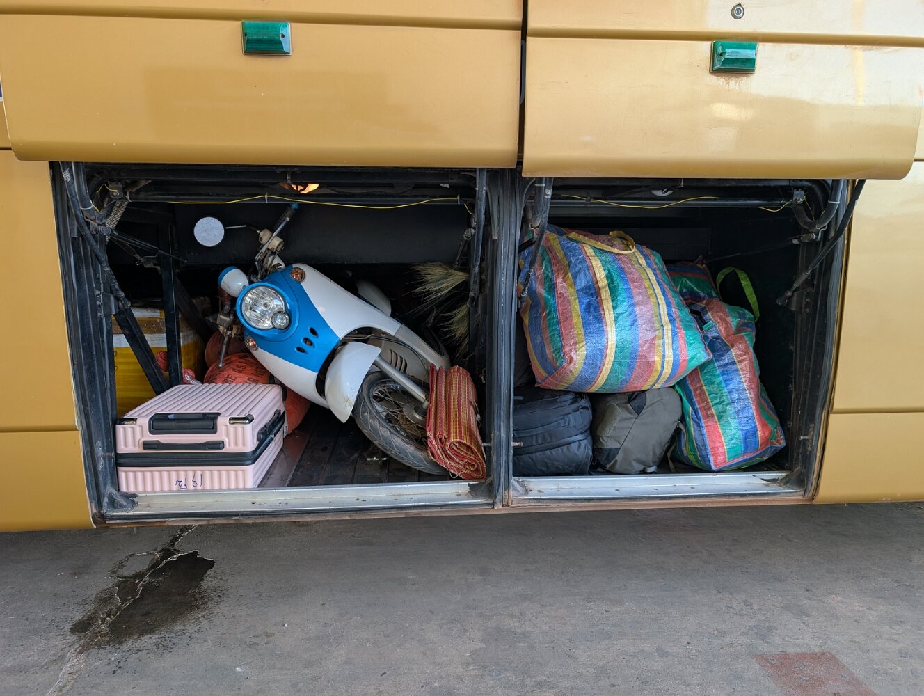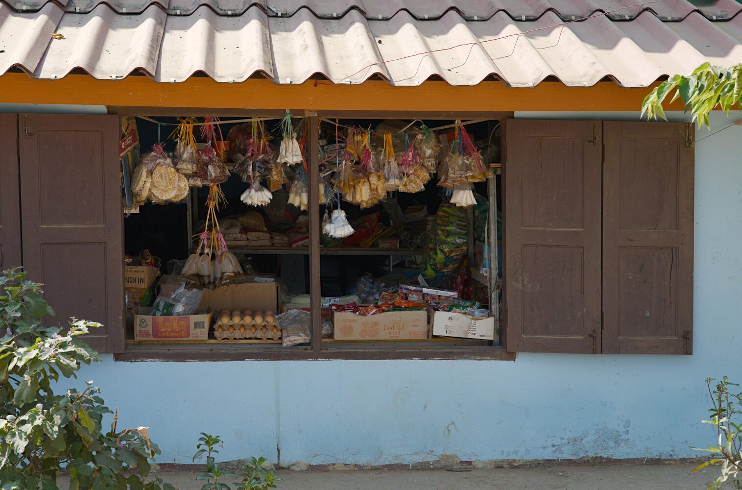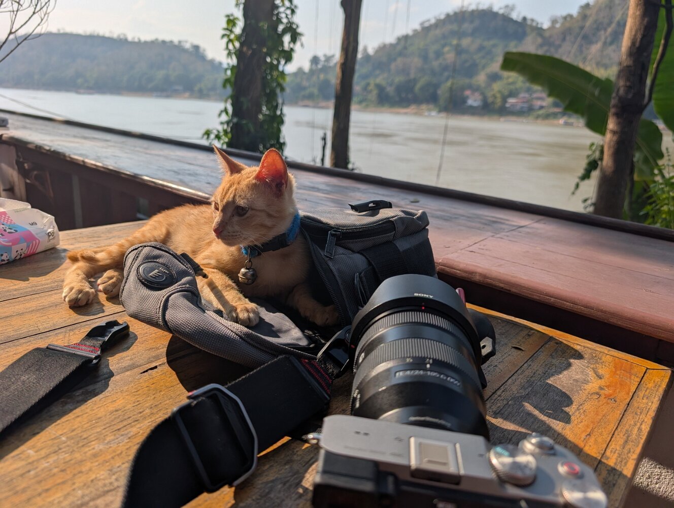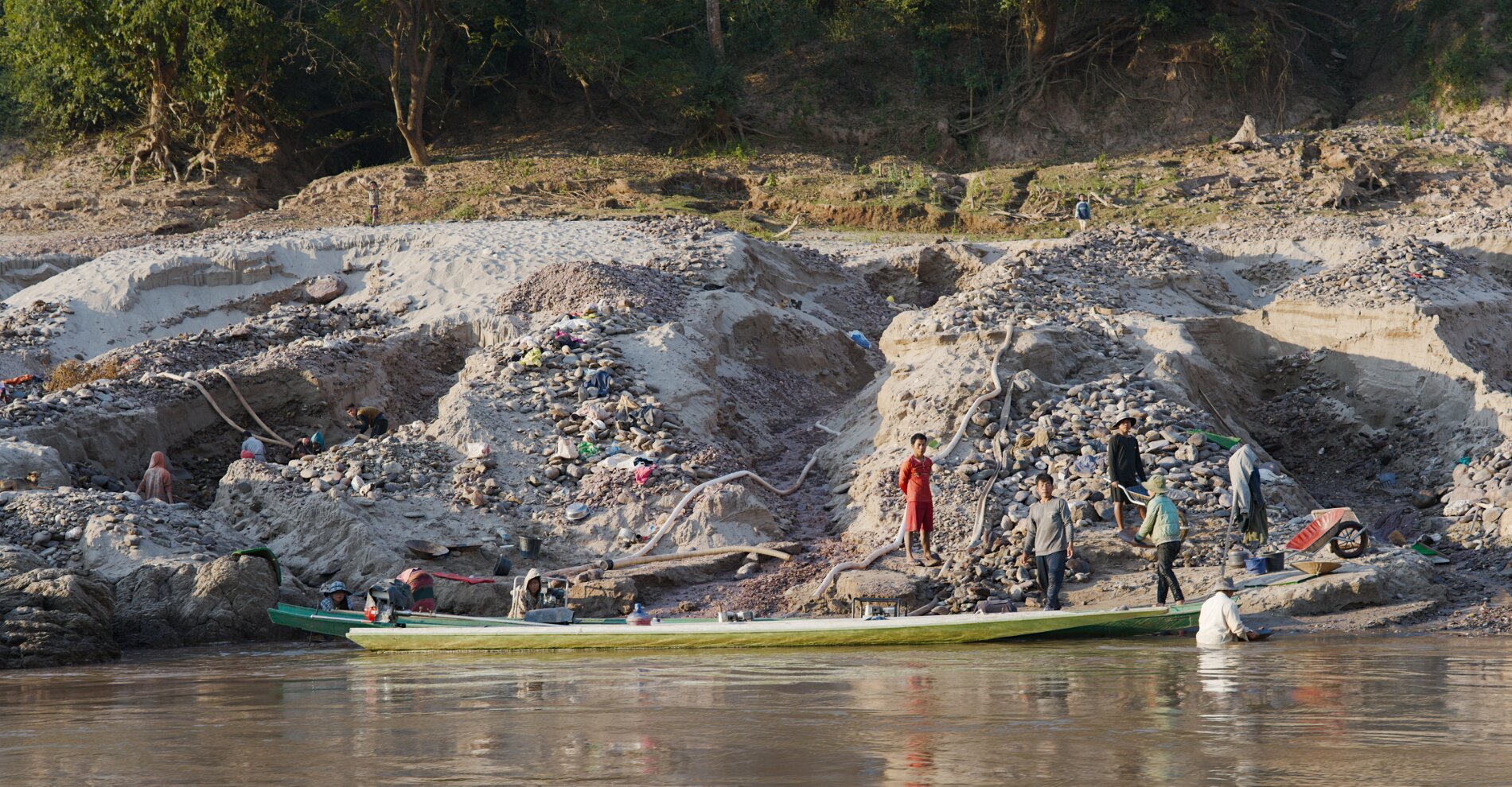 The boats are long wooden vessels with seats taken from passenger vans, and carry an eclectic mix of locals, westerners, and cargo, with no rules except "no shoes" as far as we could tell. They make frequent stops on a sandy beach or just a convenient rock in the middle of nowhere to unload a family with a dog in a bird cage, cases of Lao Beer, and perhaps a motorcycle.