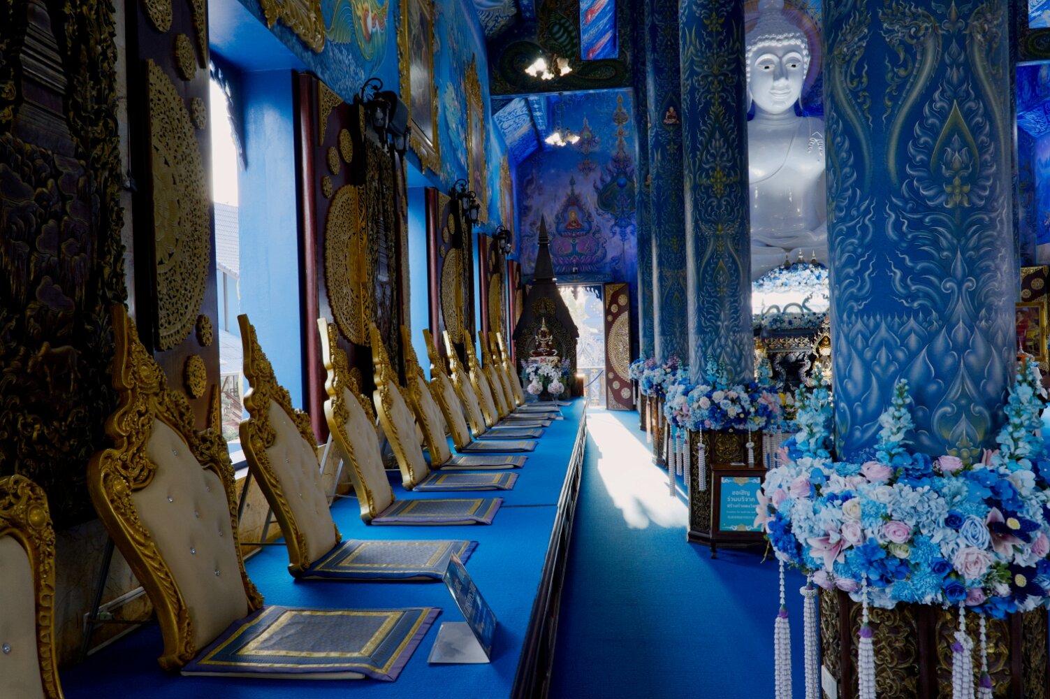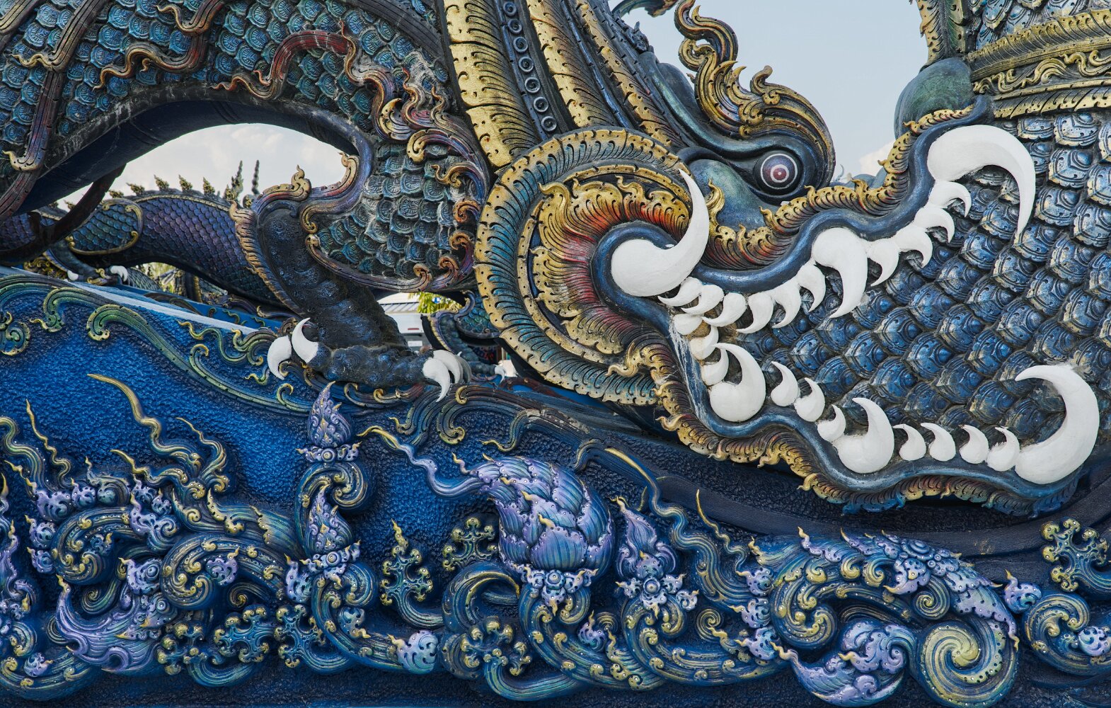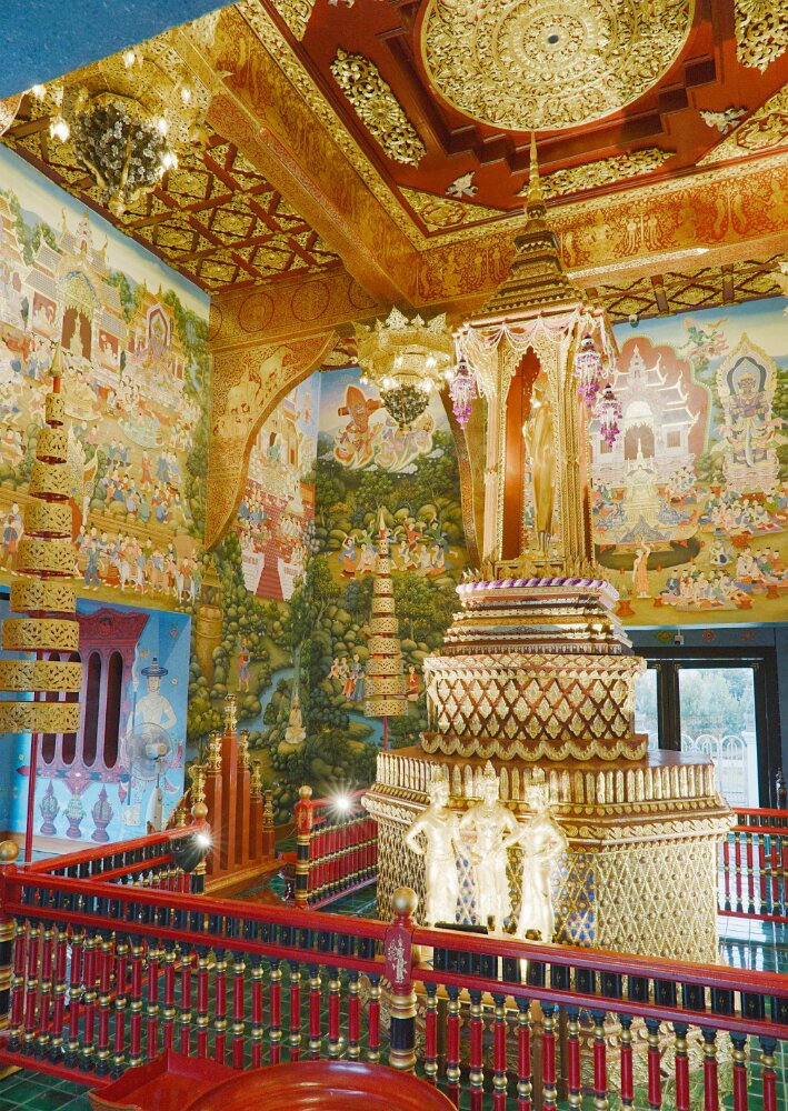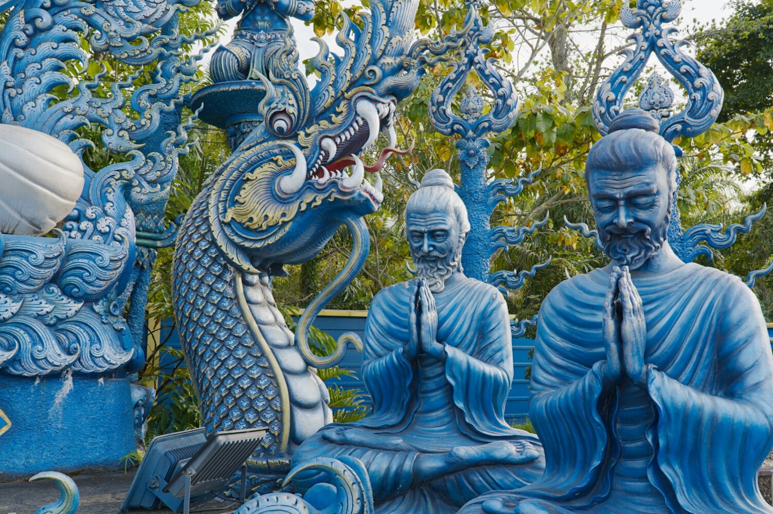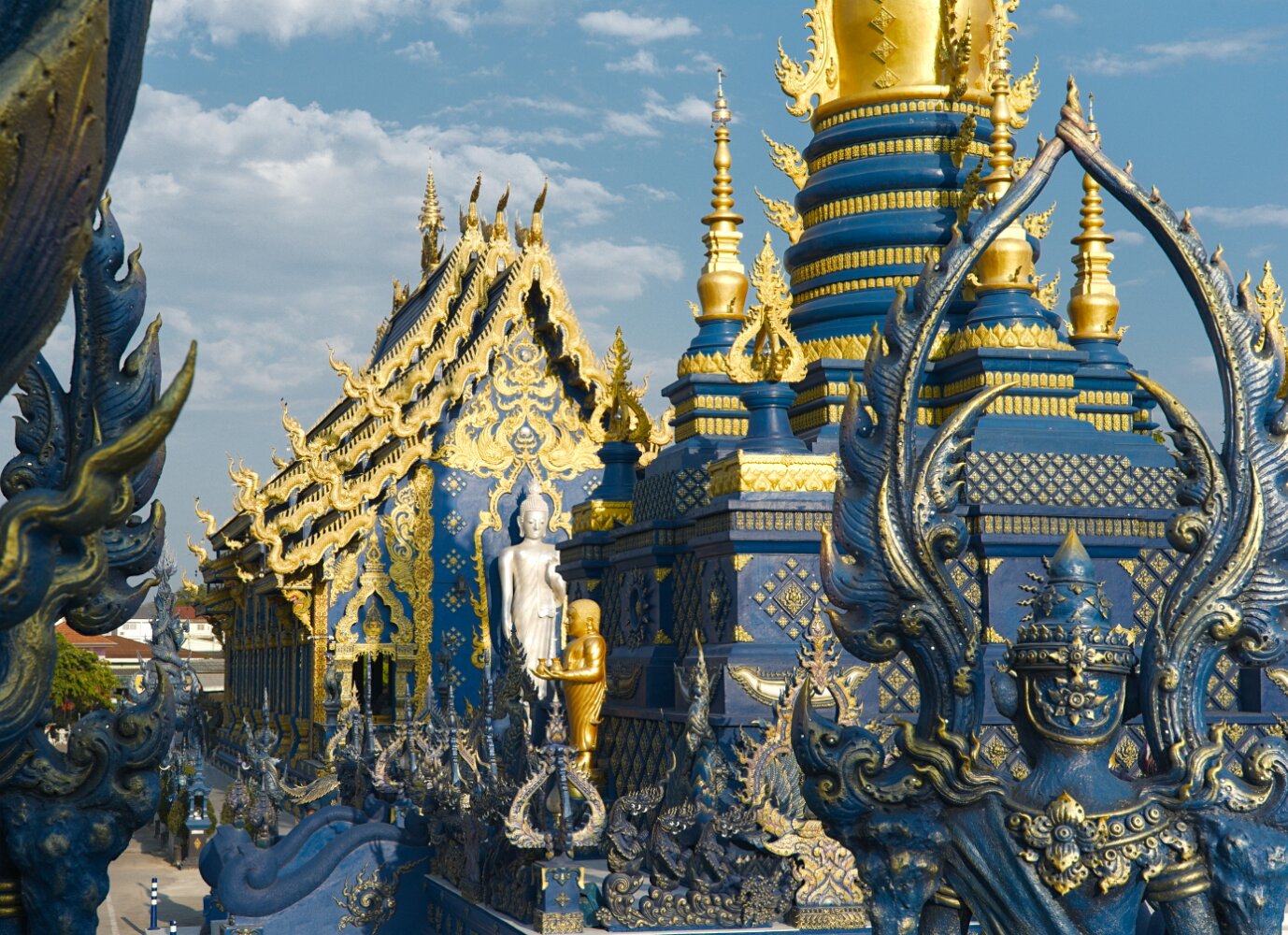 The psychedelic visual imagery of Wat Rong Suea Ten, also known as the Blue Temple, is the labor of another local folk artist, Phuttha Kabkaew, a disciple of Kositpitat.